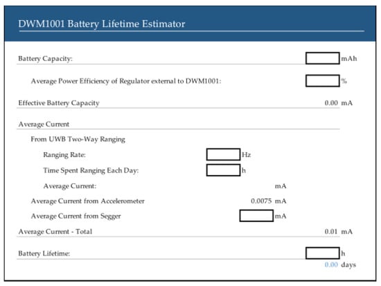 To this extent, a dedicated Excel spreadsheet (named Battery Lifetime Estimator) is provided by the DWM1001 manufacturer to help the solutions designer to size the battery and estimate its duration under the proper operative conditions. This tool has been used to predict the battery lifespan under different testing conditions involving different tag configurations and battery types. For completeness, the input form of the Battery Lifetime Estimator provided by Qorvo is shown in