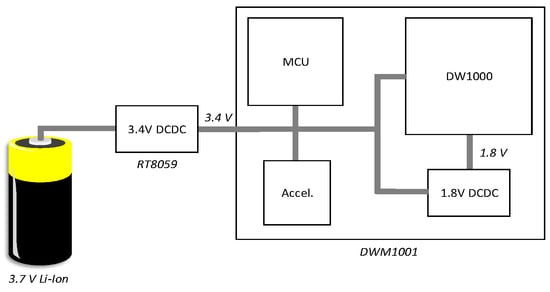 In order to investigate the reason for the low accuracy provided by the official Qorvo tool, a different configuration has been implemented and then tested. The current setup of the system is very clean and neat, composed of a Li-Ion battery, an external regulator, and a DWM1001 module. The capacity of the battery has been assessed in a previous test, while the efficiency of the external regulator (93%) has been suggested by Qorvo without any further validation. The next test configuration bypasses the external regulator to better understand if the error in the tag power consumption has to be imputed to the DWM1001 module or the RT8059 efficiency.