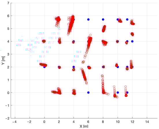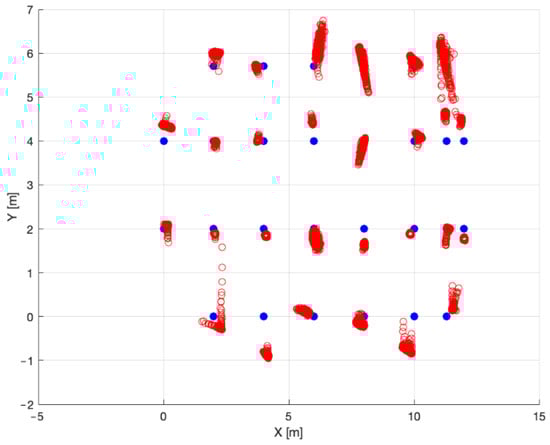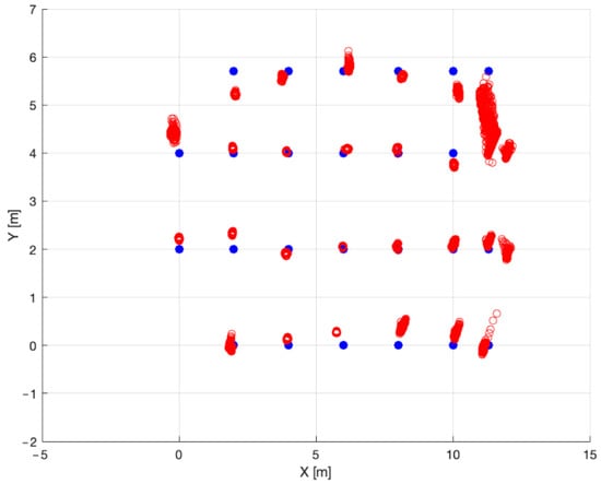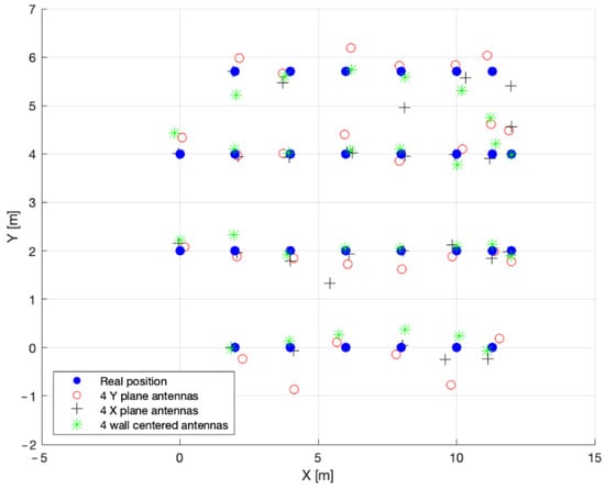 1] as the KPI used for the selection of the best configuration among the three presented ones. To this extent, the error between the position detected by the RTLS system and the known true position was calculated; data were collected by placing the RTLS tag in all the measurement points of the main room, acquiring at least 600 position points for each reference point for each of the three described configurations. Although the z-coordinate was ignored, the tag was kept at the same height of 1 m. This experiment was performed at a 10 Hz frequency, and the configuration returning the minimal average position error was considered to be the most satisfying.