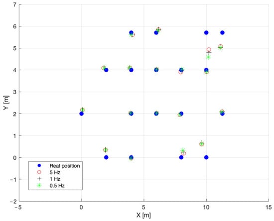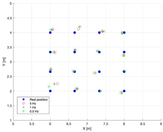 The aim of this set of experiments was to test and verify the potential correlation between the tag’s ranging frequency and the position error. Note that the use of lower frequency, overall, may lead to better battery life.