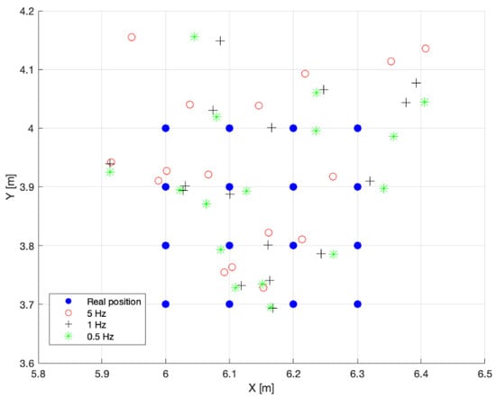 This second set of experiments was carried out in the same facility and, as already stated, the ratio behind this test is that there is a gap in literature to be filled since there are no previous studies that mention tests with more tags and, thus, considers the influence that their closeness to other tags may have, which instead represents an issue which may have a significant impact. In other words, the focus of this test was on assessing how the system’s position errors are influenced by the proximity with other tags. For completeness and to be as accurate as possible, this test was repeated for three different frequency values, i.e., 5, 1, and 0.5 Hz.