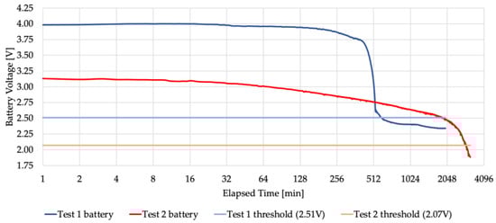 For the execution of the first test, a Li-Ion rechargeable battery was involved to evaluate the accuracy of the Battery Lifetime Estimator tool. The capacity of the battery has been determined by means of a series of five charge/discharge cycles; at the end of each cycle, the effective (measured) battery capacity has been recorded, and an average value of 121 mAh was computed. The abovementioned Qorvo tool implemented in Excel provided an estimated battery life of 37.8 h according to the following input data: