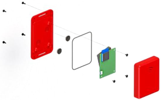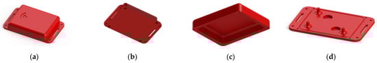 The lower case was designed as a 95 × 60 mm flat surface (3 mm thickness). In a central position, the RTLS board is placed by means of three plastic supports and relative screws. The outer flanges of the lower case are symmetrical, and both have two mm holes and one 3 × 12 mm hole. Furthermore, two cavities were made underneath the board housing to position two magnets. Lastly, on the coupling surface of each of the two parts, two O-ring grooves were cut to ensure a good seal in the final case.