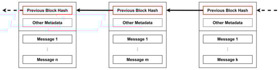 - As shown in Figure 1, data are recorded in a chain of blocks, where each block contains the hash of the previous one. A block typically consists of a header with the necessary metadata and a series of messages to be registered.
