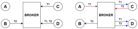 The publish/subscribe model is based on the idea that certain nodes publish information, which is further received only by nodes interested in it. In MQTT, data are labeled with a Universal Resource Identifier (URI) string called the topic, which follows a tree structure (e.g., root/parent1/leaf1). Each character in the strings used is encoded in 8-bit Unicode Transformation Format (UTF-8). To create a tree-like structure, the “/” (U+002F) character is utilized. During the publish and subscribe phases, which will be briefly described in Section 2.1.2, wildcards can be used to refer to multiple topics. The two special wildcard characters that can be used individually or simultaneously are as follows: