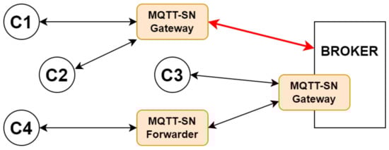 In order for MQTT to work correctly, adhering to the three different QoS levels, it is necessary to rely on devices with IP-level connectivity, which is not feasible for all IoT devices. For this reason, in 2007, IBM introduced a new version of MQTT, known as MQTT-SN, which is analogous to and compatible with the original protocol. Its latest version, 1.2, dates back to 2011, and it is not standardized by OASIS. As shown in Figure 3, two novel network elements are introduced: