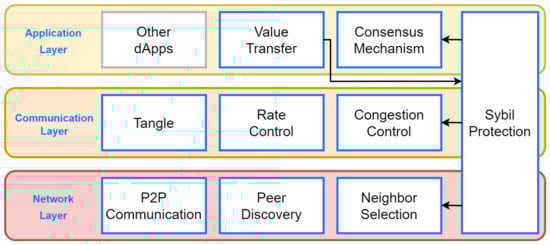 - Communication: In this Layer, protocols are implemented to control the emission rate of messages, to prevent congestion, and to support Tangle-related mechanisms that ensure a shared, consistent, and immutable view of the registered data.