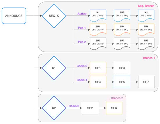 Every branch consists of at least one chain of consecutive packets, with distinct publishers and subscribers, creating a finer level of detail when determining access. To establish the order of packets issued by each publisher, a sequencing branch is utilized, with one chain assigned to each publisher, including the author. Each of these chains contains references to all the packets issued by its publisher in any branch in a chronological order. Channels employs the message types specified in Table 2 in order to create this structure, as depicted in Figure 6.