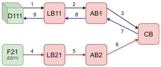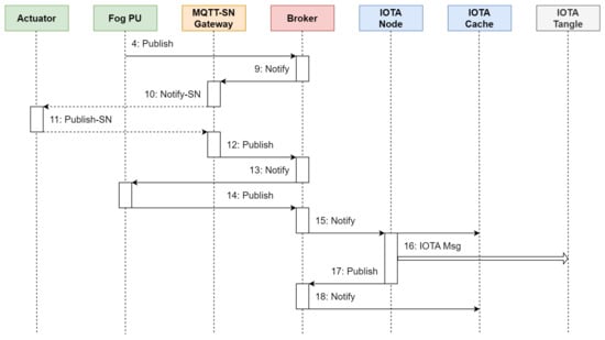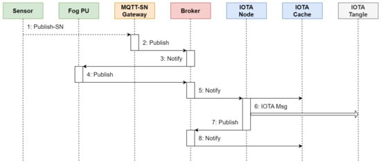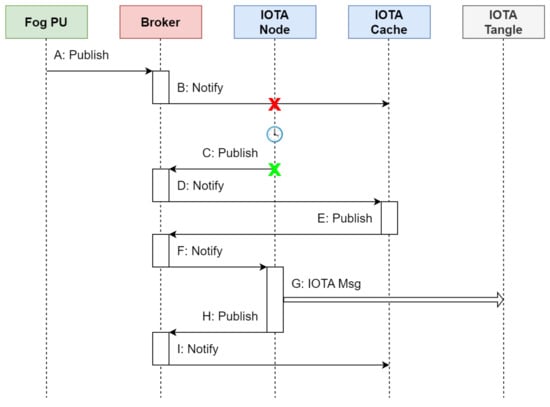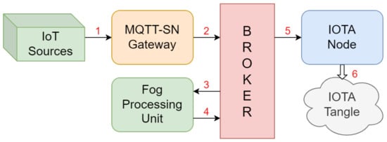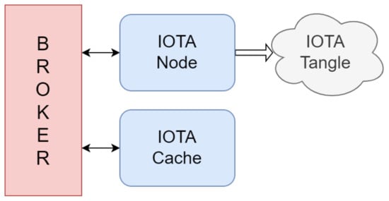 Furthermore, since the evaluation of parameters such as latency and throughput in steady-state operation conditions does not depend on IOTA Cache, we omitted this module. Lastly, all MQTT subscriptions were defined before the simulation campaign. As a result, the simulated network functional blocks and the path of each packet correspond to the configuration depicted in Figure 14.