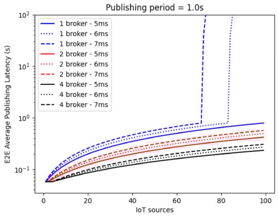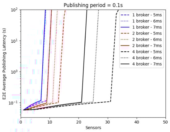 We focused on the worst-case scenario by further considering a publishing period of 0.1 s, as shown in Figure 16. In this case, messages enter the Broker(s) queues at a higher frequency, leading to earlier congestion. Therefore, when addressing a real system design, it is essential to consider the overall publishing rate and to proportionally and dynamically adjust the number of Brokers and their load-balancing scheme.