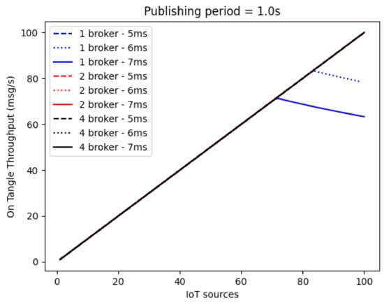 Firstly, two rounds of simulations were performed, each lasting 7200 s. In the first round, the IoT source publishing period was assumed to be equal to 1 s, while, in the second one, this value was reduced to 100 ms to focus on the worst-case scenario.