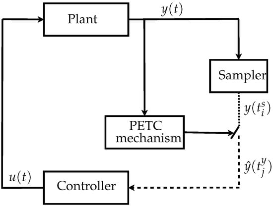A networked control system (NCS) is a feedback control system that uses communication networks to carry out data transmission between the sensors, the controller, and the actuators []. Due to its numerous benefits, it has been adopted in various domains of applications, such as sensor networks [], cyber-physical systems [], multi-agent systems [], and distributed control systems []. However, the reliability of an NCS is still a main challenge compared to a conventional point-to-point connection. The past few decades have seen extensive research on NCSs driven by their inherent challenges. In a conventional digital control system over NCS, the feedback information is sampled, and computed control inputs are then applied to actuators. Traditionally, the sampling instants and execution of control updates are implemented in a periodic time-triggered manner. One drawback of this approach is that periodic controllers can provide unnecessary inputs even when performance is good, which leads to wasteful energy use and actuator wear. Moreover, the design of the periodic sampling period is often conservative and based on the worst-case scenario. Hence, the implantation of such a method in the NCS can result in overloaded and congested traffic over the network. As a result, there will be more frequent packet failures and longer communication delays, which adversely affect the system performance or network reliability. Alternatively, to overcome these limitations, the event-triggered control technique has been proposed in the literature.