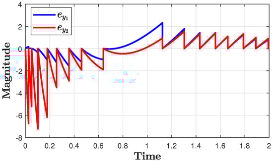 It is important to note that in view of (27), we have that . Moreover, is reset to when and are reset to , which is strictly positive when . Consequently, by using the comparison principle, it holds that for all . This property is crucial for establishing the stability of the closed-loop system, as will be shown later.