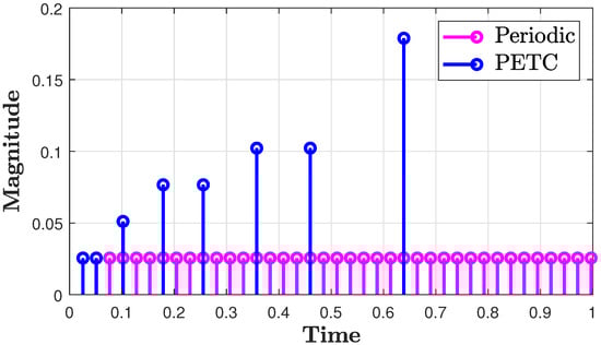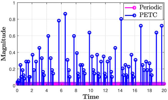 with . Note that when in (28), we recover the MATI bound of time-triggered controllers in []. By designing the sampling period T as the MATI bound, we opt to further reduce the amount of transmissions by using the PETC mechanism.