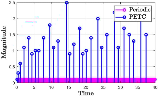 In this study, we focused on illustrating the advantage of enriching the PETC mechanism with a dynamic variable. Hence, the robustness of the approach against exogenous input, such as external disturbances, measurement noises, and transmission delays, were not considered at this stage. However, the consideration of such phenomena is relevant, and in practice, requires careful revision of the analysis, as shown in []. Moreover, the PETC mechanism has been developed for LTI systems, which allows casting the required conditions in terms of the feasibility of an LMI condition. Hence, the extension of the approach to nonlinear systems requires a different set of assumptions and the stability analysis needs to be thoroughly revisited. Furthermore, it is important to take into account other network-induced issues such as quantization [], packet dropout [], scheduling [], and malicious attacks [] to make the approach more adapted to practical implementation. Finally, the PETC scheme in this study has been designed by emulation, which can result in a conservative design, as discussed in []. Hence, the joint design for both the controller and PETC mechanism is another interesting direction for future investigations.