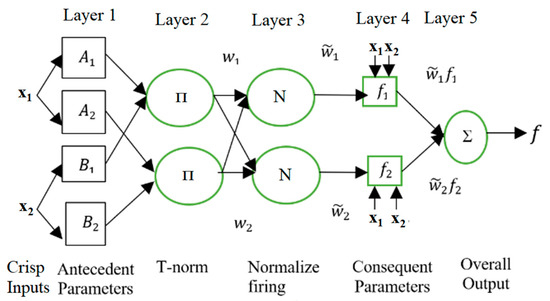 The ANFIS is a hybrid of an NN and fuzzy system, which is an inferential linguistic processing that incorporates fuzzy rules into a knowledge base [27]. The knowledge base contains fuzzy rules obtained from experts and can be adapted to produce appropriate results. However, the input–output pair must be learned to optimize the output. The NN is used to learn input–output relationships to adjust the fuzzy rules until a suitable output is found. Figure 1 shows the general architecture of an ANFIS, which has five main layers [28]. The rectangular boxes are adaptive nodes, while round boxes are fixed nodes.