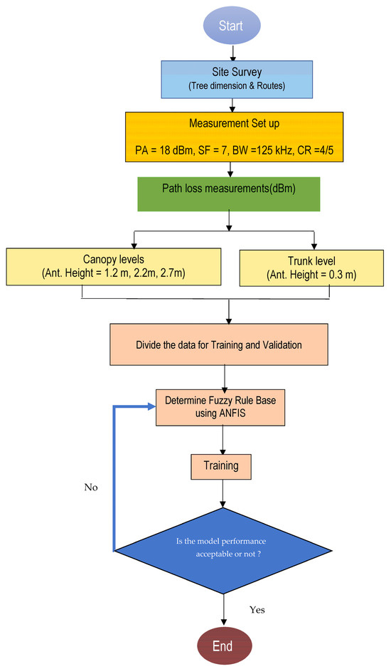 The antenna height and distance between the communication nodes influences the propagation path loss. Therefore, two inputs of the ANFIS are the antenna height in meters and logarithm of distance in meters. The output is the propagation path loss in dBm. A flowchart of the ANFIS path loss modeling is shown in Figure 2. The next section describes the site survey and measurement setup in detail.