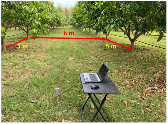 The study site was a Ruby mango plantation in Sakaeo Province, Thailand, with the GPS coordinates 13.4166954 N, 102.1368925 E. To ensure a good harvest, Ruby mango trees must be planted at a certain density. Thus, the mango tree plantation follows a specific pattern. The trees are planted in straight rows with 6 m between rows and 5 m between their trunks in the same row, as shown in Figure 3. The plantation has 320 trees per hectare. The tree dimensions are summarized in Table 2. The average total tree height was about 4.5 m, which comprised a trunk height of 0.55 m, a trunk diameter of 0.51 m, a canopy depth of 3.96 m, and an average canopy diameter of 5.69 m.