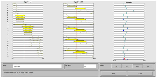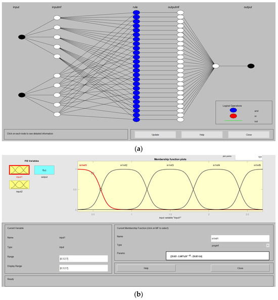 Figure 5a shows the ANFIS structure for training comprising five membership functions with the two adjusted inputs (Figure 5b,c) for 25 rules and 25 membership functions to obtain the output. Figure 6 shows the inference engine based on 25 rules with the first input as the antenna height of 1.2 m and the second input as the log-distance (d) of 0.698 (5 m), which provides a path loss output of 57.0 dB. Table 4 shows a good agreement of the ANFIS with validation.
