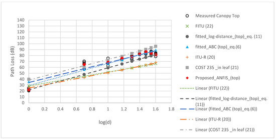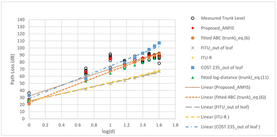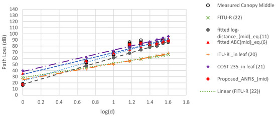 The ANFIS demonstrated good agreement with the measurement data compared with the empirical models in Section 2. The empirical model in Equation (6) provides the best prediction with an AME, MAE, MAPE, and RMSE values of 0.11, 0.77, 5.8, and 3.69, respectively (please see Table 5, Table 6, Table 7 and Table 8). In the case of the three conventional models, ITU-R (1), COST 235 (2), and FITU-R (3) provide large error prediction where either the transmit or receive antenna is near a small grove of trees. However, the COST 235 provides better prediction in the UHF band, as shown in Table 5, Table 6, Table 7 and Table 8, which the signal propagates at different antenna heights with the selected AME, MAE, MAPE, and RMSE values of 5.41, 6.86, 14.04, and 8.61, respectively. Additionally, the proposed ANFIS model provides a very high sensitivity compared with the empirical models, as indicated by the red dots in Figure 7, Figure 8, Figure 9 and Figure 10 for the trunk level and bottom, middle, and top canopy levels, respectively. These confirm the advantage of the proposed ANFIS model as well.