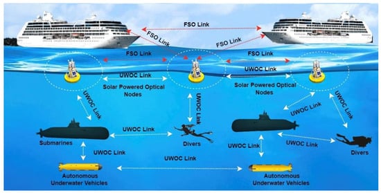 - Menaka, D.; Gauni, S.; Manimegalai, C.T.; Kalimuthu, K. Challenges and vision of wireless optical and acoustic communication in underwater environment. Int. J. Commun. Syst. 2022, 35, e5227. [Google Scholar] [CrossRef]