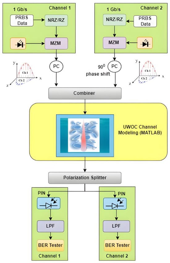 - Increased Transmission Capacity: The use of PDM allows for the simultaneous transmission of multiple data streams over the same optical channel. As a result, the data rate of our proposed PDM-UWOC system is significantly higher than existing UWOC systems that rely on single-polarization transmission. This enhancement in transmission capacity opens up new possibilities for high-data-rate underwater communication applications.