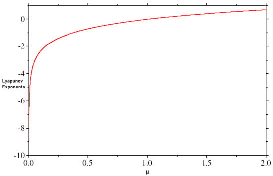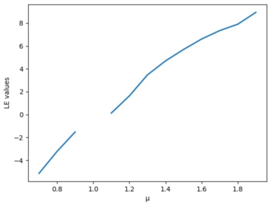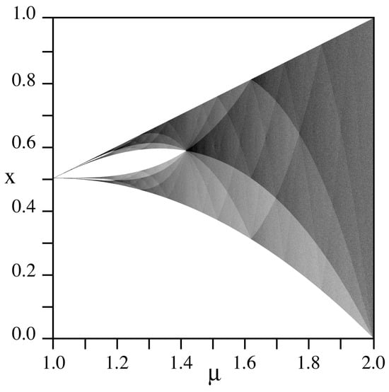 Moreover, it should be noted that is undefined. Therefore, for any orbit of the system that does not include 0.5, the Lyapunov exponent, denoted as , is equal to the natural logarithm of the control parameter . Specifically, when , and when . This observation aligns perfectly with the bifurcation diagram presented in Figure 2, confirming the instability of fixed points and periodic points when . Notably, the fact that is always positive for implies that the bifurcation diagram of the system (as evident from Figure 2) lacks periodic windows typically observed in the case of a logistic map. Figure 4 displays the Lyapunov exponents of the system as a function of its control parameter .