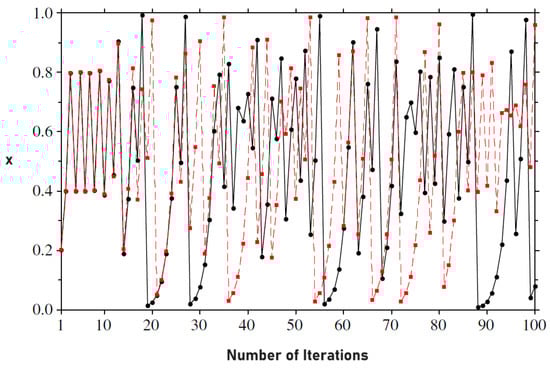 In the defined system, the function f operates on the interval [0, 1] and maps it to itself (i.e., belongs to [0, 1] for all greater than or equal to zero). The initial condition denoted as and the control parameter, denoted as , play crucial roles in Equation (1). The initial condition represents the starting value, while the control parameter determines the behavior of the system. Specifically, is a positive real constant within the range [0, 2]. The collection of real values is referred to as the orbit of the system. For every , there exists a corresponding orbit. The nature of the dynamical behavior exhibited by the system varies depending on the value of the control parameter , ranging from predictable to chaotic.