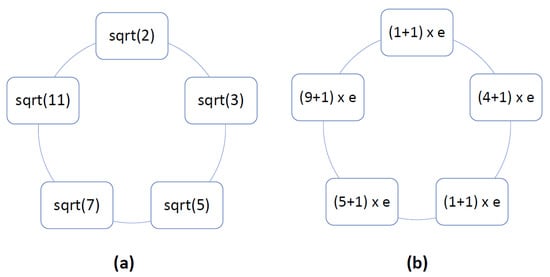 In the left diagram (a), a circular array with five elements is depicted, initialized with the square roots of 2, 3, 5, 7, and 11 (random numbers). On the right diagram (b), a five-element state is shown, initialized with five digits of Pi (1, 4, 1, 5, and 9) multiplied by the constant e.