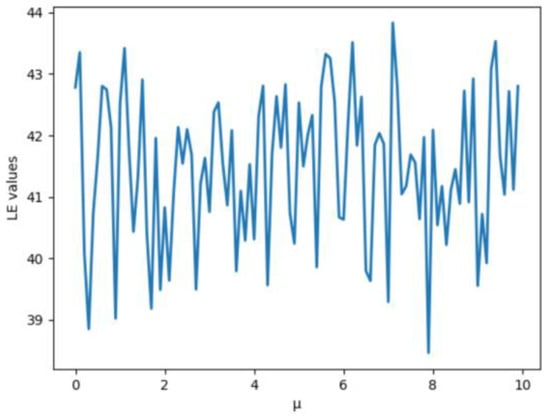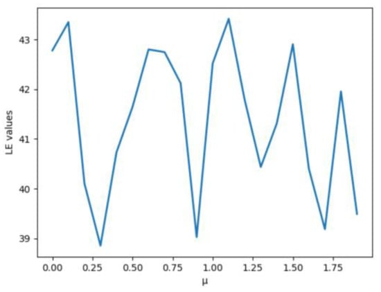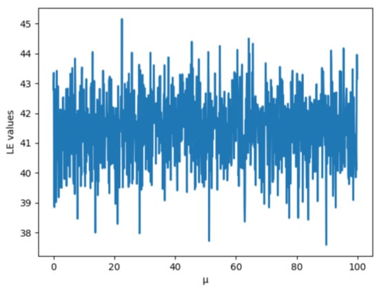 Figure 7 showcases the Lyapunov exponents for the original Tent-Map, while Figure 8, Figure 9 and Figure 10 exhibit the results for the SBTM with distinct ranges of the control variable. It becomes apparent that Figure 7 bears a resemblance to Figure 4, with positive values emerging as approaches 1.2. In contrast, the SBTM demonstrates significantly higher positive values for different ranges of µ starting from 0 to 2, 10, and 100, as depicted in Figure 8, Figure 9 and Figure 10, respectively.
