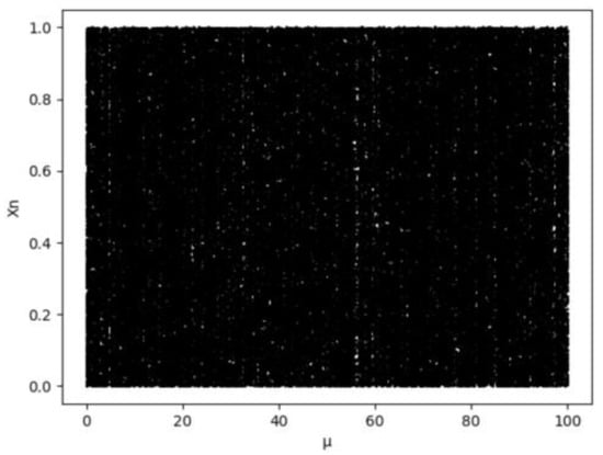 To ensure chaotic behavior and fulfill cryptographic requirements, the control parameter should be selected to be greater than one. In stream cipher applications, the iterate values of the system need to exhibit random-like properties and cover the entire range from 0 to 1. Therefore, the choice of the control parameter is crucial in generating iterate values that are distributed uniformly from 0 to 1. As the control parameter approaches two, the iterate values demonstrate a chaotic distribution that spans a dense point set within a finite interval converging toward (0, 1). This behavior has been extensively studied in the literature [,,].