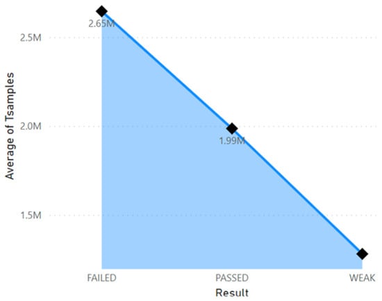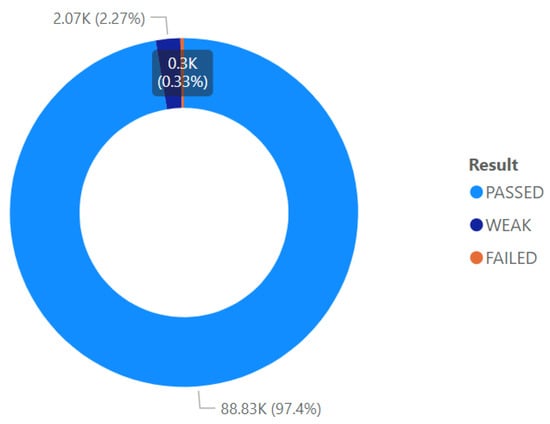 In evaluating the performance of the proposed SBTM, Dieharder subjects the generator’s sequences to a battery of 91,200 individual tests (in total) to assess different aspects of randomness and statistical properties. In an analysis of the results obtained, as depicted in Table 3 and summarized in Figure 14, it was found that out of the total tests conducted, 303 tests exhibited failures (only 0.33% of the total), indicating significant deviations from randomness. On the other hand, a substantial majority of 88,830 tests passed (97.4% of the total), demonstrating the generator’s ability to generate sufficiently random sequences. Additionally, 2067 tests were categorized as weak (2.27% of the total). This comprehensive examination of the Dieharder test results provides valuable insights into the strengths and high quality of the tested random number generator.
