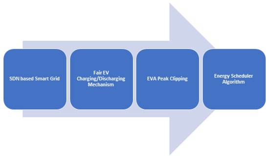 Several recent scientific studies on unidirectional V2G (V1G), bidirectional V2G, vehicle-to-building (V2B) [], show that electric vehicles integration enhance the flexibility of energy communities, energy districts and grids. Our research study considers V2G for two main reasons. On the one hand, we were mainly concerned with the lack of energy in a smart grid. In fact, V2G is advantageous to the grids in order to make energy balancing, specifically that intermittent renewable energy sources are considered. Moreover, V2G is cost-effective due to the fact that users may sell excess cars to power the grids. On the other hand, even though vehicle-to-everything (V2X) encompasses bidirectional charging technologies, V2G stands out as it is a direct transfer of power from vehicles to grids and not to utilities.