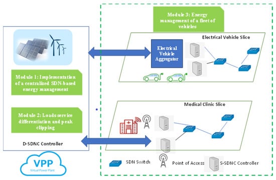 - Energy optimization process is critical and should be controlled efficiently. Therefore, we integrate the software defined network technology that controls timely loads, network slices, the Virtual Power Plant (VPP), and the electric vehicles aggregator. On the other hand, the EVA is responsible for orchestrating the charging or discharging of vehicles connected to the system, taking into account the energy supplied or required by the VPP.
