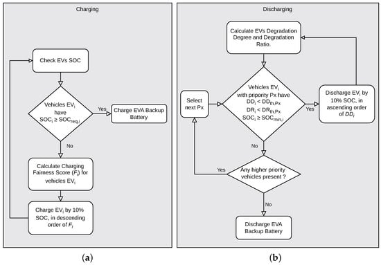 Figure 4a shows an overview of the EV charging algorithm. The algorithm starts by evaluating the state of charge (SOC) of each EV’s battery. Only EVs with an SOC below the predefined minimum requirement () are considered eligible for charging. In case all EVs have a SOC greater than , the available power from the smart grid is allocated to charge the EVA’s backup batteries. Nevertheless, if selected EVs require charging, they are scheduled based on a fairness score.