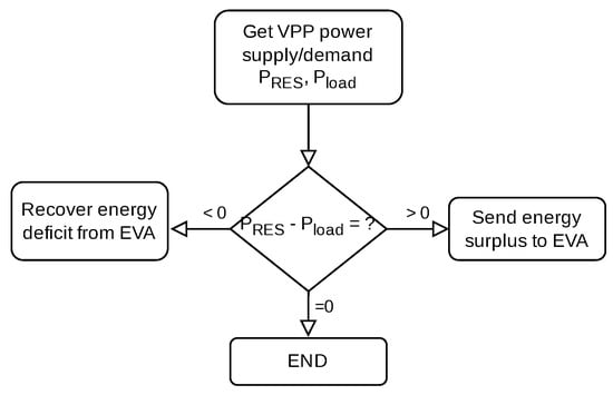 Figure 5 shows the energy management scheme used by the VPP to satisfy the constraints of the connected entities. It follows a periodic decision making process at 15-min intervals. In each cycle, VPP measures the difference between the power supplied by RES and the consumer power demand. When the demand exceeds the supply, the VPP demands power supply from the EVA. On the other hand, when the supply exceeds the demand, the excess power is supplied to the EVA for storage. Note that the EVA can also demand power from VPP to satisfy the EV users need. However, in an effort to alleviate pressure on the smart grid, EV charging is restricted to low-demand hours, aligning with the valley-filling program.