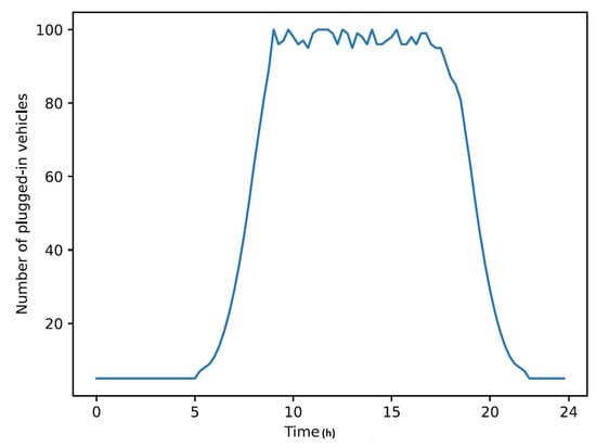 The EVs are considered at the same time as a power source and a power load. Two types of EVs are considered: urgent vehicles and vehicles belonging to employees. The employee vehicles arrive from 5 AM to 9 AM and leave from 5:30 PM to 10 PM. Urgent vehicles do not follow any strict schedule; they randomly leave and arrive between 9 AM to 5:30 PM. The connection of EVs to the smart grid through the V2G terminals in the healthcare facility’s car park is simulated by a normal distribution, depicted in Figure 7, as: