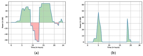(a): Smart-grid power observed by VPP before applying EV charging/discharging algorithms, (b): after applying EV charging/discharging algorithms.