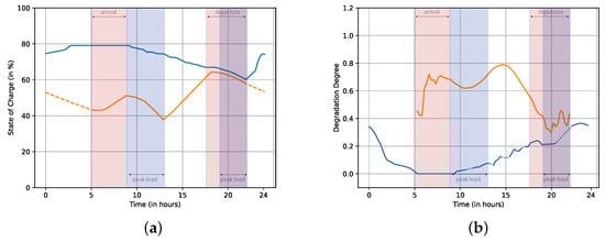 Only EVs with degradation degrees () and degradation ratios () below predefined thresholds (, and ) for their respective priority groups are eligible for discharging. The eligible EVs are discharged by 10% SOC in ascending order of their degradation degrees. If no vehicles within selected priority group are eligible for discharging, higher-priority vehicles are considered based on their degradation degrees and degradation ratios. If all EVs reached their respective minimum SOC limits during discharging, the required power for the smart grid is sourced from the EVA’s backup batteries.