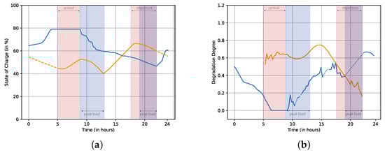 The discharging algorithm, as depicted in Figure 4b, discharges EVs according to predefined priorities while also incorporating a mechanism to minimize battery wear. EVs are grouped based on their priorities (). The vehicles with the lowest priority () are chosen first as potential discharging candidates. To ensure fairness in the discharging process and protect against battery wear, two factors, namely the degradation degree and the degradation ratio, are employed.