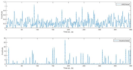 Figure 3 provides a visual representation of the simulated channel under two distinct noise modeling scenarios: (a) where noise is represented as additive white Gaussian noise (AWGN) and (b) in the presence of industrial noise.