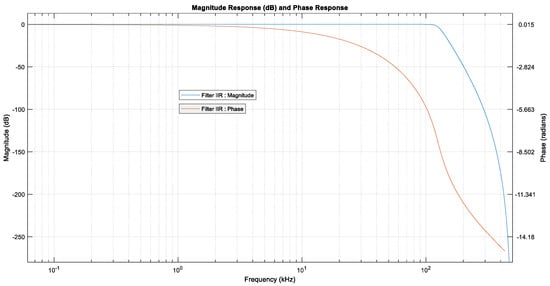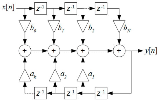 The infinite impulse response filter used in our simulations is described by the difference equation represented by Equation (17), where x represents the value of the input signal and y represents the value of the filter’s output signal [42].