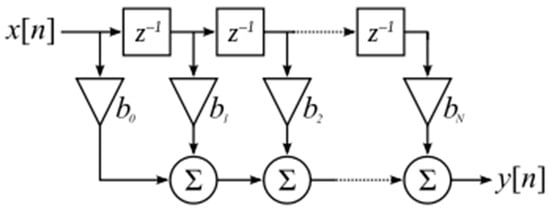 where x(n), y(n), and h(k) represent the input and output samples and filter coefficients, respectively. Each output sample is obtained by summing the most recent input samples, which characterizes the order N of the FIR filter. Figure 6 illustrates an FIR filter: