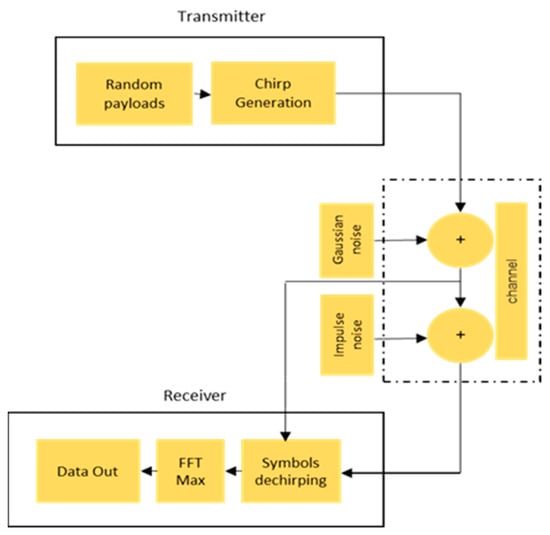In this section, we will evaluate the performance of CSS modulation adopted by LoRa technology in an industrial environment focusing on the PER. We will essentially consider the “one-to-many” and “many-to-one” architectures specific to the LoRaWAN network, which is based on a star topology [44], as shown in Figure 7. Typically, in the LoRa context, this star configuration allows end devices to exchange with one or more gateways via the LoRa physical layer. These gateways are then connected to a central server using the standard IP protocol. This server is linked to an application server and can also interact downlink with the end devices via the gateway. Figure 8 illustrates the evaluated architecture, primarily consisting of the modulator and demodulator, in addition to an industrial channel.