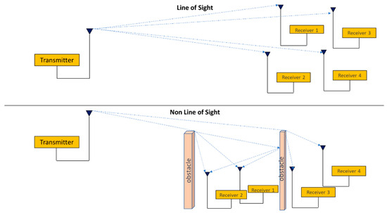 where y(t), h(t), n(t), and x(t) represent the received signal, channel impulse response, random noise, and transmitted signal, respectively. Typically, in industrial environments, nodes are arranged in a LOS configuration. The authors in [22,39] carried out several channel propagation measurements in different industrial environments. Their measurements showed that in an industrial environment, the Rice distribution, Rayleigh, and normal Log characteristics are tracked by the time envelope of the signal received at a fixed point. Our wireless transceiver, based on LoRa technology, is evaluated using a Rician distribution when the configuration is LOS, and a Rayleigh distribution in the opposite case NLOS.