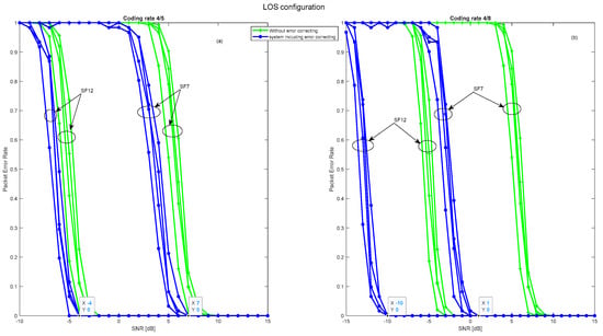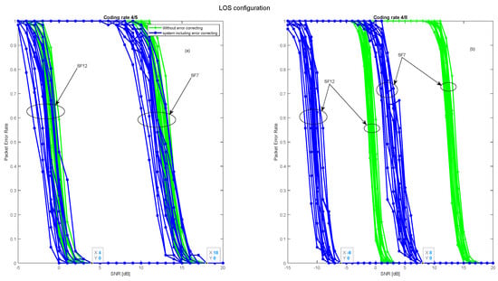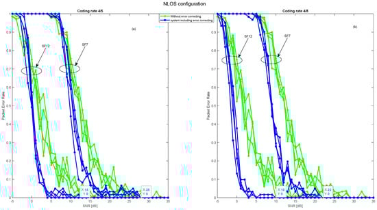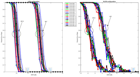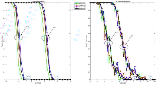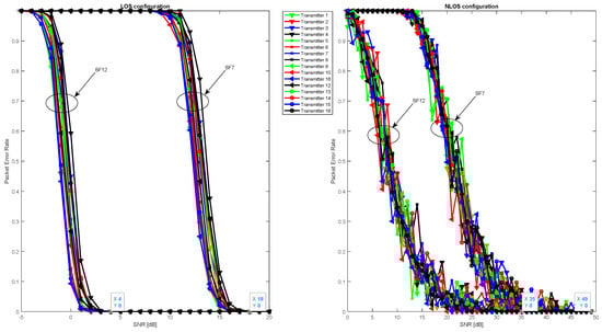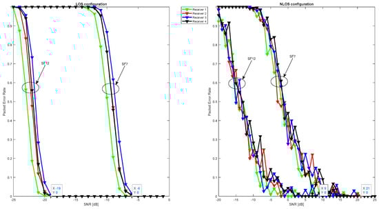 Figure 10 illustrates that signal quality is disturbed in terms of PER due to Gaussian noise in the LOS configuration in addition to the fading effect in the NLOS configuration. However, in the LOS configuration, the signal remains detectable, and packets are received correctly for negative SNR values ranging from −19 dB to −6 dB for spreading factors 12 and 7, respectively. In the NLOS configuration, the signal undergoes strong attenuation, resulting in a gain loss of over 28 dB in SNR, which means that packets are only received correctly for SNR values ranging from 9 up to 21 dB for spreading factors 12 and 7, respectively.