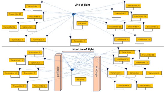 Two configurations, LOS and NLOS, were considered. In this work, we have considered that the industrial and AWGN channels are propagation channels with Rician fading in the LOS configuration and Rayleigh fading in the NLOS configuration at a frequency of 868 MHz [22,39].