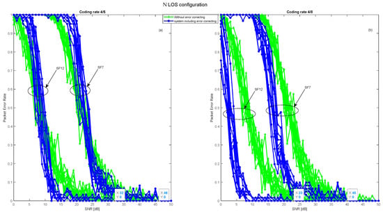PER over a fading channel with the industrial noise for the OtM mode, using the error correcting code 4/5 coding rate and FIR filter. (a) PER in LOS configuration; (b) PER in NLOS configuration.