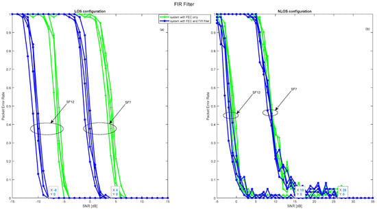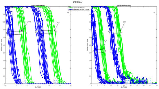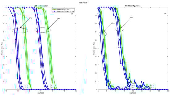 The introduction of IIR and FIR filters to receivers operating in OtM mode is a crucial step in enhancing LoRa’s PER performance, whatever the configurations involved. This improvement, however, manifests itself differently depending on the type of filter and its order. The details of these dynamics are illustrated in Figure 22 and Figure 23, which highlight the optimum performance associated with each filter order. In a LOS configuration, the positive impact of these filters is indisputable. Both the IIR and FIR filters deliver an appreciable 4 dB gain in signal-to-noise ratio. This translates into perfect packet reception, with values of −7 dB and 4 dB for spreading factors 7 and 12, respectively. In NLOS mode, on the other hand, the benefits, while present, are slightly attenuated due to fading phenomena and disturbances such as industrial noise. Despite these challenges, a gain of 2 dB is noted, enabling the correct reception of 90% of packets with values of 2 dB and 12 dB for the two spreading factors mentioned. Overall, the incorporation of IIR and FIR filters proves to be a strategic initiative to improve the reliability of LoRa transmission in OtM mode, although the degree of improvement intrinsically depends on the transmission context.