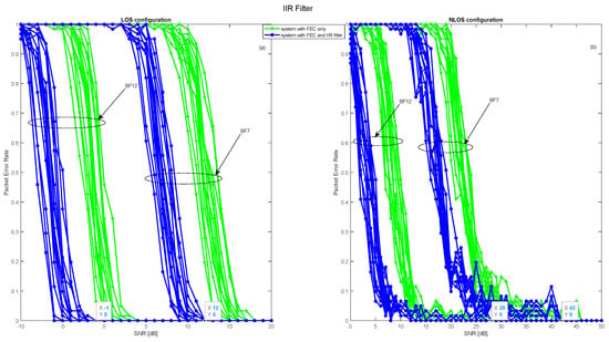 PER over a fading channel with the industrial noise for the MtO mode, using the error correcting code 4/5 coding rate and IIR filter. (a) PER in LOS configuration; (b) PER in NLOS configuration.
